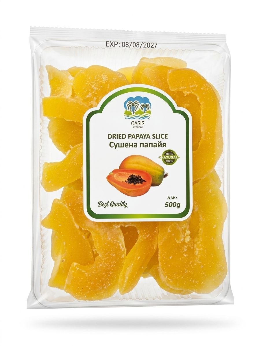 Папайя сушена – це цукат, який виготовляють із плода пальмоподібної рослини родини Карикових. Культивується папайя в багатьох тропічних країнах Центральної та Південної Америки, Африки та Азії. Саме дерево досягає висоти 5-10 м, до того ж плодоносити починає через 6 місяців з моменту висадки саджанця (а в особливо сприятливих умовах, наприклад, в Індонезії, плоди з’являються вже через три місяці після висаджування). Така скоростиглість “компенсується” короткою “тривалістю життя” цієї рослини, яка становить близько 5 років. Плоди папайї великі, довжиною від 15 до 45 см і в діаметрі від 50 до 70 см. У зрілому вигляді вони м’які на дотик і мають яскраво-жовте або помаранчеве забарвлення. Особливістю папайї можна також назвати наявність такого унікального ферменту як папаїн. З нього виготовляють медичні препарати для лікування багатьох хвороб, зокрема міжхребцевого остеохондрозу. Крім папаїну в плодах папайї міститься безліч інших корисних вітамінів і мікроелементів. У сушеному вигляді вони зберігаються практично в повному обсязі. Поряд із користю цей продукт має незабутній смак, який цілий рік зможе порадувати і дорослих, і дітей.
